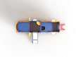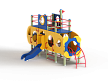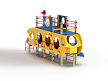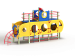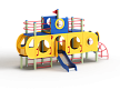 Детский игровой комплекс скомпонован в форме подводной лодки, состоит из четырех спаренных башен и одной радиусной полубашни, являющейся передом подводной лодки. Центральная башня - двухъярусная, имитирует рубку подводной лодки. Ограждениями первого яруса являются фанерные листы с круглыми вырезами-лазами. На задней части первого яруса два ограждения с пластиковыми иллюминаторами. На первом ярусе центральной башни расположена горка, напротив неё - ограждение с лазом и перекладина с канатом. Входами на первый ярус со стороны улицы являются шведские стенки, расположенные под боковыми ограждениями с лазами. К задней части подводной лодки крепится лиана наклонная. Переход с первого яруса на второй обеспечен лестницей металлической, крепящейся снизу к полу первого яруса, проходящей сквозь люк-вырез пола второго яруса, сверху крепится к столбам башни. Второй ярус огражден фанерными ограждениями с пластиковыми иллюминаторами и дуговыми металлическими перекладинами.
