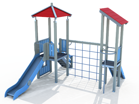 Детский игровой комплекс состоит из двух башен с качелями. На первой башне установлены крыша наклонная, ограждение из бруса, шест, перекладина и трап из бруса с альпинистскими камнями. На второй башне установлены горка, лестница, крыша четырехскатная, четыре ограждения из бруса и примыкающие к ней качели на деревянных столбах. Башни соединены полипропиленовой сеткой.