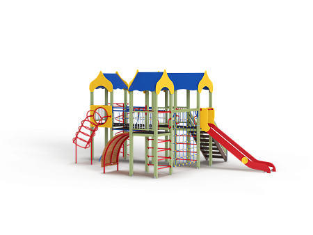 Детский игровой комплекс состоит из трех башен. На первой башне установлены альпинистская стенка с перекладиной и канатом, шест прямой, ограждение из бруса с перекладинами и шведская стенка. На второй башне установлена лестница, горка и два ограждения из бруса с перекладинами . Первая и вторая башня соединяются полипропиленовой сеткой. На третьей башне установлено ограждение из бруса с перекладинами, шест спираль и спираль наклонная. Вторая и третья башни соединены подвесным мостом.