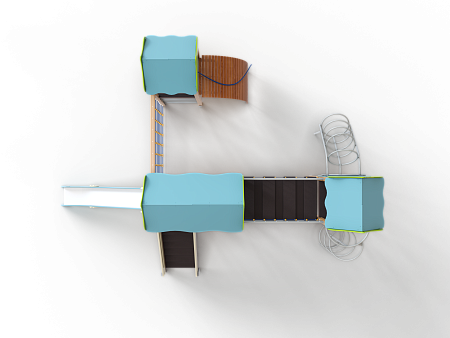 Детский игровой комплекс состоит из трех башен. На первой башне установлены альпинистская стенка с перекладиной и канатом, шест прямой, ограждение из бруса с перекладинами и шведская стенка. На второй башне установлена лестница, горка и два ограждения из бруса с перекладинами . Первая и вторая башня соединяются полипропиленовой сеткой. На третьей башне установлено ограждение из бруса с перекладинами, шест спираль и спираль наклонная. Вторая и третья башни соединены подвесным мостом.