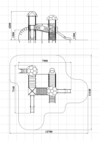 Детский игровой комплекс состоит из трех башен с крышами, имеет художественное оформление в стиле баскетбола. На первой башне установлены лестница, горка, вынесенная шведская стенка с рукоходом, перекладиной с гимнастическими кольцами и шестом спиралью. На второй башне установлена горка и фанерное ограждение. На третьей башне установлена лиана, ограждение фанерное и шведская стенка. Первая и вторая башни соединяются разновысоким мостом с фанерными перилами. Вторая и третья башни соединены подвесным качающимся мостом с фанерным ограждением.