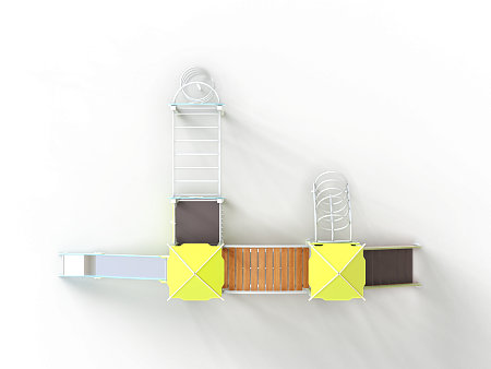 Детский игровой комплекс состоит из двух башен и одной полубашни с вынесенной шведской стенкой. На первой башне с полубашней установлена альпинистская стенка с перекладиной и канатом, ограждение металлическое, вспомогательные ручки, шведская стенка и примыкающий к ней рукоход с вынесенной шведской стенкой, две декоративные арки, со стороны вынесенной шведской стенки установлен шест спираль. На второй башне установлена горка, крыша и ограждение. На третьей башне установлена крыша, лестница, ограждение и спираль наклонная. Вторая и третья башня соединены радиусным мостом с металлическими перилами.