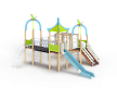 Детский игровой комплекс состоит из трех башен с крышами. На первой башне установлена лестница, спираль наклонная, ручки вспомогательные, ограждение с круглым лазом, вынесенная шведская стенка с рукоходом, перекладиной с гимнастическими кольцами и шестом спиралью. На второй башне установлена горка и фанерное ограждение. На третьей башне установлена лиана, ручки вспомогательные, ограждение фанерное и шведская стенка. Первая и вторая башни соединяются разновысоким мостом с металлическими перилами. Вторая и третья башни соединены подвесным качающимся мостом.