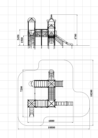 Детский игровой комплекс состоит из трех башен с крышами. На первой башне установлена лестница, спираль наклонная, ручки вспомогательные, ограждение с круглым лазом, вынесенная шведская стенка с рукоходом, перекладиной с гимнастическими кольцами и шестом спиралью. На второй башне установлена горка и фанерное ограждение с декоративными элементами. На третьей башне установлена лиана, ручки вспомогательные, ограждение фанерное с декоративными элементам и шведская стенка. Первая и вторая башни соединяются разновысоким мостом с фанерными перилами. Вторая и третья башни соединены подвесным качающимся мостом с фанерным ограждением и декоративными элементами.
