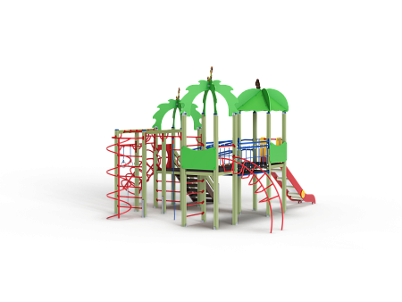 Детский игровой комплекс состоит из трех башен с крышами. На первой башне установлена лестница, спираль наклонная, ручки вспомогательные, ограждение с круглым лазом, вынесенная шведская стенка с рукоходом, перекладиной с гимнастическими кольцами и шестом спиралью. На второй башне установлена горка и фанерное ограждение. На третьей башне установлена лиана, ручки вспомогательные, ограждение фанерное и шведская стенка. Первая и вторая башни соединяются разновысоким мостом с металлическими перилами. Вторая и третья башни соединены подвесным качающимся мостом.