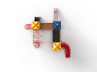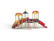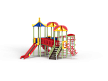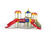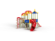 Детский игровой комплекс состоит из трех башен с крышами. На первой башне установлена лестница, спираль наклонная, ручки вспомогательные, ограждение с круглым лазом, вынесенная шведская стенка с рукоходом, перекладиной с гимнастическими кольцами и шестом спиралью. На второй башне установлена горка и фанерное ограждение с декоративными элементами. На третьей башне установлена горка-труба пластиковая, ручки вспомогательные, ограждение фанерное с декоративными элементам и шведская стенка. Первая и вторая башни соединяются разновысоким мостом с фанерными перилами. Вторая и третья башни соединены подвесным качающимся мостом с фанерным ограждением и декоративными элементами.