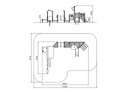 Комплекс выполнен в виде комбинации башен с треугольными и прямоугольными площадками из бруса. На комплексе установлено наполнения в виде: стенок с подвижными элементами, стенки с окном и столиком, ручек, шагохода, столика, сетки, горки, перекладины с накладками и тунельного перехода, выполненного из прозрачного высокопрочного пластика. Металлические элементы комплекса выполнены из стали с оцинкованным покрытием. Оцинковка металла производится методом электрохимической гальванизации. Скат горки выполнен из нержавеющей стали. Деревянные столбы выполнены из тщательно отшлифованной древесины и окрашены высококачественным лаковым покрытием. Сетки изготовлены из многожильного армированного износостойкого каната. Стенки, ограждения, крыши, столики, борта и ограждения горки выполнены из HPL пластика.