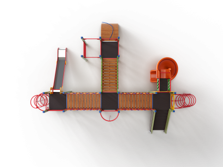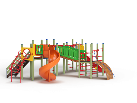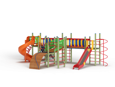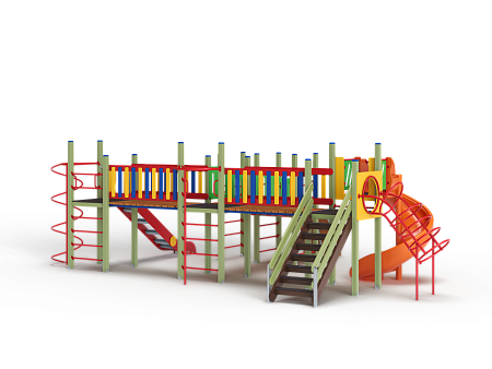 Детский игровой комплекс состоит из четырёх башен. На первой башне установлена лестница, горка винтовая пластиковая, ограждение с круглым лазом, спираль. На второй башне установлены шведская стенка, шест, ручки вспомогательные и перекладина. На третьей башне установлены горка, шест спираль, две шведские стенки, ручки вспомогательные, перекладины. На четвертой башне уста-новлены трап-барабан с перекладиной и канатом, две шведские стенки, перекладины и вспомогательные ручки. Четвертая башня имеет продолжение в виде вынесенной шведской стенки и соединяется с ней перекладинами усиленными. Первая и вторая башни соединены прямым мостом с фанерными перилами из балясин, вторая и третья прямым мостом с фанерными перилами из балясин, вторая и четвертая разновысоким мостом с фанерными перилами..