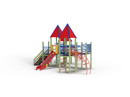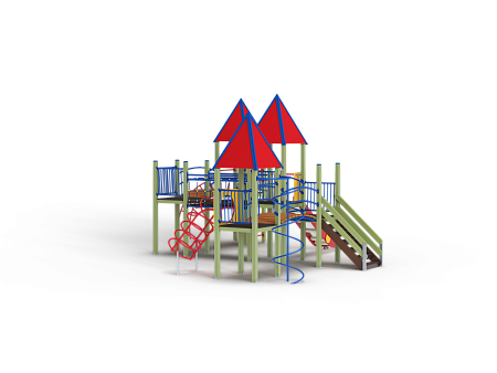 Детский игровой комплекс состоит из пяти башен, на трёх башнях установлена пирамидальная крыша. На первой башне установлена спираль, крыша, ограждение с круглым лазом, шест спираль, ручки вспомогательные, ограждение металлическое. На второй башне (полубашня) установлены ограждение металлическое и лестница. На третьей башне установлены крыша, горка, ручки вспомогательные и ограждение металлическое. На четвертой башне установлены два ограждения металлических. На пятой башне установлены крыша, металлическое ограждение,  шведская стенка и лиана наклонная. Первая и вторая башни соединены радиусным мостом с металлическими перилами. Третья и четвертая соеденины подвесным качающимся мостом. Четвертая и пятая башни соединены радиусным мостом с металлическими перилами.