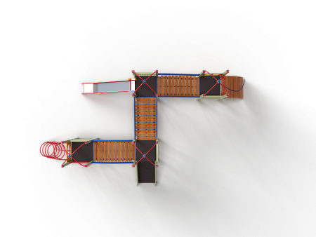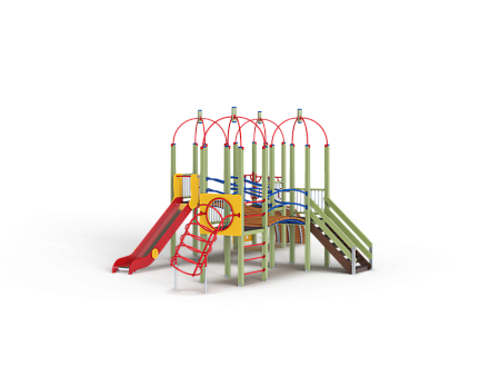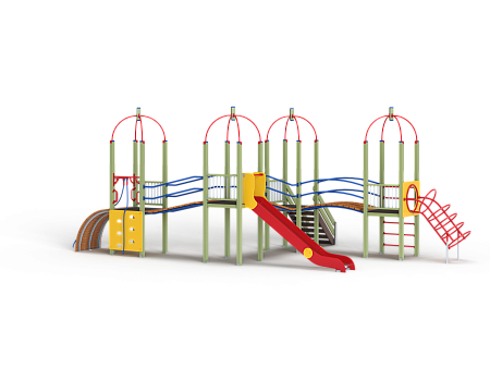 Детский игровой комплекс состоит из четырех башен с металлическими крышами. На первой башне установлена спираль, ограждение фанерное с круглым лазом, шведская стенка и ограждение из бруса с перекладинами. На второй башне установлены ограждение из бруса с перекладинами, лестница. На третьей башне установлена горка, ограждение из бруса с перекладинами. На четвертой башне установлены ограждение из бруса с перекладинами, альпинистская стенка, перекладины с канатом, трап барабан, вспомогательные ручки. Первая и вторая башни соединены радиусным мостом с металлическими перилами, вторая с третьей, и третья с четвертой разновысокими мостами с металлическими перилами.