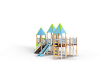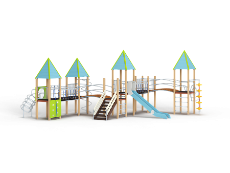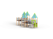 Детский игровой комплекс состоит из шести башен, на четырёх башнях установлена крыша. На первой башне установлена крыша, спираль наклонная, ограждение с лазом, ручки вспомогательные, ограж-дение металлическое, альпинистская стенка с пере-кладиной и канатом. На второй башне установлены крыша, ограждение металлическое, шест спираль, перекладина и ручки вспомогательные. На третьей башне (полубашня) установлены лестница, перекла-дины и шведская стенка. На четвертой установлены крыша, ограждение металлическое, горка и ручки вспомогательные. На пятой два металлических ограждения. На шестой установлены крыша, швед-ская стенка, лиана наклонная, шест с колесами, пе-рекладины и ручки вспомогательные. Первая и вто-рая башни соединены подвесным мостом, вторая и третья радиусным мостом, четвертая и пятая под-весным мостом, пятая и шестая радиусным мостом. Все резьбовые соединения должны быть закрыты разноцветными пластиковыми заглушками.