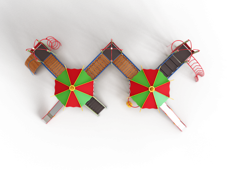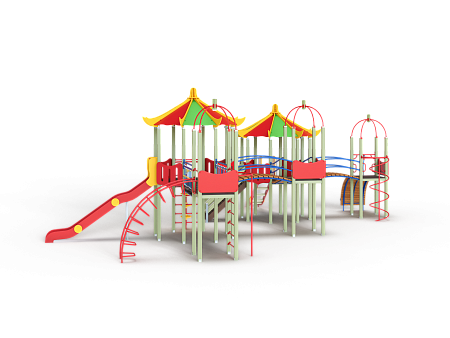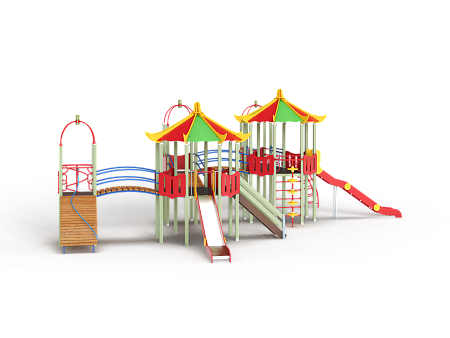 Детский игровой комплекс состоит из пяти башен. На двух башнях установлена крыша в форме восьмигранной пагоды, на трёх башнях установлена крыша металлическая со столбом. На восьмигранных башнях установлены горки, шест с колесами пластиковыми, ручки вспо-могательные, лестница и фанерные ограждения. На башнях с металлической крышей установлены шест, лиана, ручки вспомогательные, трап барабан с перекладиной и канатом, шест спираль, перекладины и фанерные ограждения. Башни соединены четырьмя мостами: наклонным, подвесным и двумя радиусными мостами с металическими перилами.