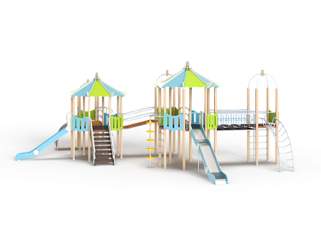 Детский игровой комплекс состоит из пяти башен. На двух башнях установлена крыша в форме восьмигранной пагоды, на трёх башнях установлена крыша металлическая со столбом. На восьмигранных башнях установлены горки, шест с колесами пластиковыми, ручки вспо-могательные, лестница и фанерные ограждения. На башнях с металлической крышей установлены шест, лиана, ручки вспомогательные, трап барабан с перекладиной и канатом, шест спираль, перекладины и фанерные ограждения. Башни соединены четырьмя мостами: наклонным, подвесным и двумя радиусными мостами с металическими перилами.
