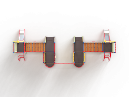 Детский игровой комплекс состоит из четырёх ба-шен с крышами. На первой башне установлена горка, перекладина, лиана и ограждение фанерное с декоративными накладками. На второй башне установлено ограждение фанерное с декоративными накладками, лестница, перекладины, балкон. На третьей башне установлено ограждение фанерное с декоративными накладками, лестница, перекладины, балкон. На четвертой башне установлена горка, перекладина, лиана и ограждение фанерное с декоративными накладками. Первая башня соединена со второй прямым мостом с фанерными перилами, третья соединяется с четвертой прямым мостом с фанерными перилами. Между второй и третьей башней установлена декоративная зубчатая фанерная арка, на уровне фасадов крыш.