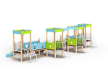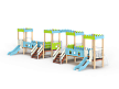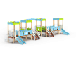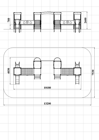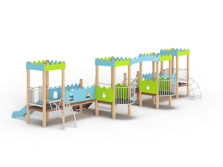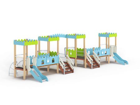 Детский игровой комплекс состоит из четырёх ба-шен с крышами. На первой башне установлена горка, перекладина, лиана и ограждение фанерное с декоративными накладками. На второй башне установлено ограждение фанерное с декоративными накладками, лестница, перекладины, балкон. На третьей башне установлено ограждение фанерное с декоративными накладками, лестница, перекладины, балкон. На четвертой башне установлена горка, перекладина, лиана и ограждение фанерное с декоративными накладками. Первая башня соединена со второй прямым мостом с фанерными перилами, третья соединяется с четвертой прямым мостом с фанерными перилами. Между второй и третьей башней установлена декоративная зубчатая фанерная арка, на уровне фасадов крыш.