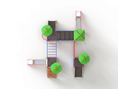 Детский игровой комплекс состоит из четырех башен с крышами. На первой башне установлена лестница, ограждение фанерное, ручки вспомогательные, перекладины и альпинистская стенка. На второй башне установлены горка, ограждение фанерное и перекладины. На третьей башне установлены лестница, шест, альпинистская стенка, перекладины и ручки вспомогательные.  На четвертой башне установлена горка, альпинистская стенка, трап барабан с перекладиной и канатом, перекладины и ручки вспомогательные. Первая и вторая башни соединены металлической вертикальной сеткой, вторая и третья башни соединены подвесным качающимся мостом, третья и четвертая башни соединены рукоходом. Все резьбовые соединения должны быть закрыты пластиковыми заглушками.Детский игровой комплекс состоит из четырех башен с крышами. На первой башне установлена лестница, ограждение фанерное, ручки вспомогательные, перекладины и альпинистская стенка. На второй башне установлены горка, ограждение фанерное и перекладины. На третьей башне установлены лестница, шест, альпинистская стенка, перекладины и ручки вспомогательные.  На четвертой башне установлена горка, альпинистская стенка, трап барабан с перекладиной и канатом, перекладины и ручки вспомогательные. Первая и вторая башни соединены металлической вертикальной сеткой, вторая и третья башни соединены подвесным качающимся мостом, третья и четвертая башни соединены рукоходом.