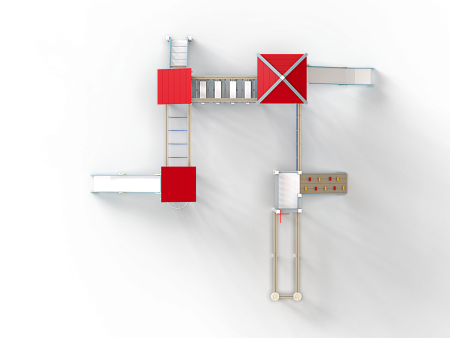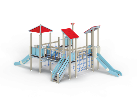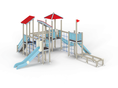 Детский игровой комплекс состоит из четырёх башен. На первой башне установлены крыша наклонная, ограждение из бруса, шест, перекладина и горка. На второй башне установлены крыша наклонная, ограждение из бруса, перекладина и лестница. На третьей башне установлены крыша четырехскатная, горка, перекладина и четыре ограждения из бруса. На четвёртой башне установлены три ограждения из бруса, пять перекладин, декоративные флажки и трап из бруса с альпинистскими камнями  Первая и вторая башни соединены полипропиленовым переходом, вторая и третья башни соединены мостом подвесным из деревянного бруса и полипропиленового каната, третья и четвёртая башни соединены сеткой полипропиленовой.