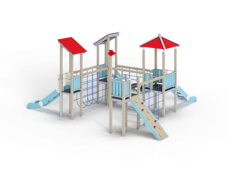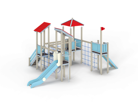 Детский игровой комплекс состоит из четырёх башен. На первой башне установлены крыша наклонная, ограждение из бруса, шест, перекладина и горка. На второй башне установлены крыша наклонная, ограждение из бруса, перекладина и лестница. На третьей башне установлены крыша четырехскатная, горка, перекладина и четыре ограждения из бруса. На четвёртой башне установлены три ограждения из бруса, пять перекладин, декоративные флажки и трап из бруса с альпинистскими камнями Первая и вторая башни соединены полипропиленовым переходом, вторая и третья башни соединены мостом подвесным из деревянного бруса и полипропиленового каната, третья и четвёртая башни соединены сеткой полипропиленовой.