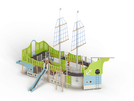 Детский игровой комплекс скомпонован в форме корабля с двумя металлическими мачтами. На боковых частях и на кормовой части установлены три горки. По периметру корабля расположены альпинистские стенки с перекладинами и канатами, фанерные ограждения с декоративными накладками, вынесенная сетка полипропиленовая, две полипропиленовые лестницы, шест с пластиковыми колесами, мосты прямые с фанерными перилами и мосты подвесные.