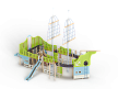 Детский игровой комплекс скомпонован в форме корабля с двумя металлическими мачтами. На боковых частях и на кормовой части установлены три горки. По периметру корабля расположены альпинистские стенки с перекладинами и канатами, фанерные ограждения с декоративными накладками, вынесенная сетка полипропиленовая, две полипропиленовые лестницы, шест с пластиковыми колесами, мосты прямые с фанерными перилами и мосты подвесные.