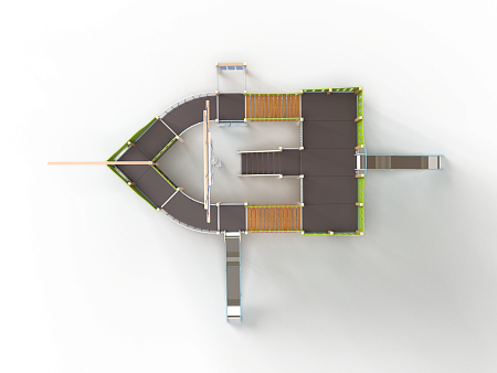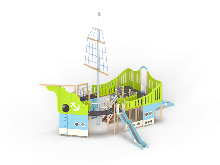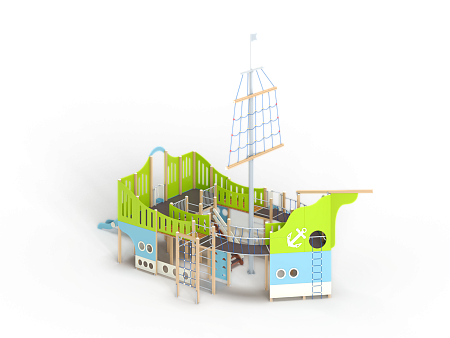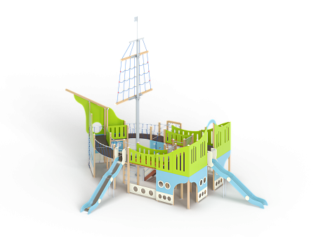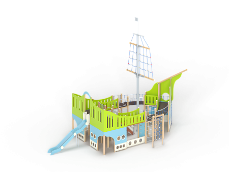 Детский игровой комплекс скомпонован в форме корабля с одной металлической мачтой. На боковой части и на кормовой части установлены две горки. По периметру корабля расположены альпинистская стенка с перекладинами и канатами, фанерные ограждения с декоративными накладками, вынесенная сетка полипропиленовая, две полипропиленовые лестницы, мосты прямые с фанерными перилами и мосты подвесные.