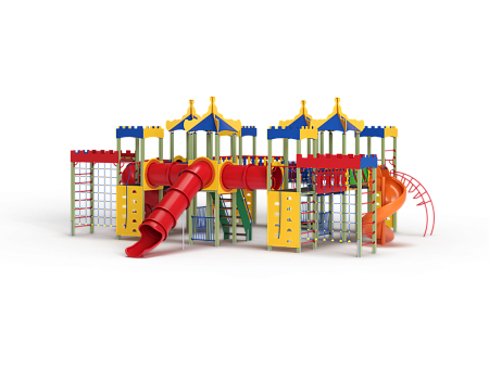 Детский игровой комплекс состоит из восьми башен с крышами. Башни расположены в форме квадрата. На первой башне установлены перекладины, шест с пластиковыми колесами, ручки вспомогательные, альпинистская стенка с перекладиной и канатом. На второй башне установлены перекладина, трап, ограждение фанерное и металлическое. На третьей башне установлены лиана, ручки вспомогательные, перекладина, альпинистская стенка с перекладиной и канатом. На четвертой башне установлена горка пластиковая винтовая, балкон. На пятой башне установлены перекладины, альпинистская стенка с перекладиной и канатом. Сбоку пятая башня имеет продолжение в виде спортивного комплекса с полипропиленовой сеткой, шведской стенкой, декоративными накладками и рукоходом. На шестой башне установлена пластиковая горка-труба, ограждение металлическое и лестница. На седьмой башне установлены перекладины, ручки вспомогательные, альпинистская стенка с перекладиной и канатом. Сбоку седьмая башня имеет продолжение в виде спортивного комплекса с полипропиленовой сеткой, шведской стенкой, фанерными накладками и рукоходом. На восьмой башне установлена винтовая пластиковая горка-труба и балкон.