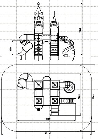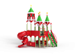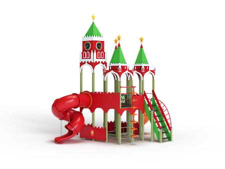 Детский игровой комплекс выполнен двухъярусным и стилизованных в виде Кремля. На первом ярусе должны быть установлены фанерные ограждения с декоративными накладками и сидения. На втором ярусе должны располагаться горка пластиковая винтовая, горка-труба пластиковая винтовая, четыре крыши, фанерные ограждения с декоративными накладками, перекладины, шест с пластиковыми колесами, сидения и лиана. Вход на второй ярус должен осуществляться через лестницу со стороны улицы.