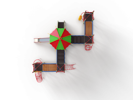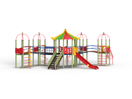 Детский игровой комплекс состоит из пяти башен. На одной башне установлена крыша в форме восьмигранной пагоды, на четырёх крыша металлическая со столбом. На восьмиграной башне установлена горка, лестница и фанерные ограждения. На башнях с металлической крышей установлены шест, шест спираль, шест с пластиковыми колесами, спираль, ограждение с круглым лазом, лиана, ручки вспомогательные, фанерные ограждения. Башни соединены двумя подвесными мостам и двумя мостами радиусными с металлическими перилами.
