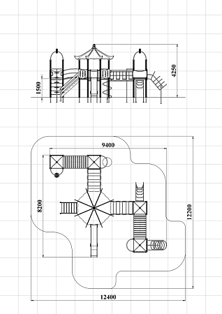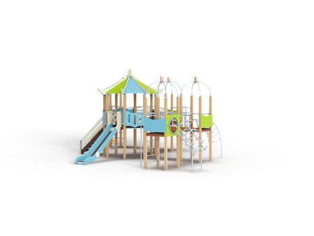 Детский игровой комплекс состоит из пяти башен. На одной башне установлена крыша в форме восьмигранной пагоды, на четырёх крыша металлическая со столбом. На восьмиграной башне установлена горка, лестница и фанерные ограждения. На башнях с металлической крышей установлены шест, шест спираль, шест с пластиковыми колесами, спираль, ограждение с круглым лазом, лиана, ручки вспомогательные, фанерные ограждения. Башни соединены двумя подвесными мостам и двумя мостами радиусными с металлическими перилами.