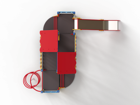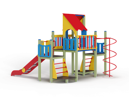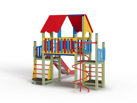 Детский игровой комплекс состоит из трех разновысоких башен. На первой башне установлена лестница, горка, фанерное ограждение и ручки вспомогательные. На второй сдвоенной башне, установлены фанерные ограждения и крыша. На третьей башне установлены ограждение, шест спираль, лестница и ручки вспомогательные.
