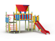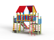 Детский игровой комплекс состоит из трех разновысоких башен. На первой башне установлена лестница, горка, фанерное ограждение и ручки вспомогательные. На второй сдвоенной башне, установлены фанерные ограждения и крыша. На третьей башне установлены ограждение, шест спираль, лестница и ручки вспомогательные.