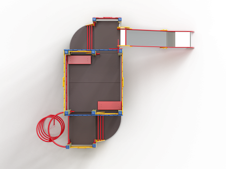 Детский игровой комплекс состоит из трех разновысоких башен. На первой башне установлена лестница, горка, фанерное ограждение и ручки вспомогательные. На второй сдвоенной башне, установлены ограждения фанерные и крыша. На третьей башне установлены ограждение, переклади-ны, шест спираль, лестница и ручки вспомогательные.