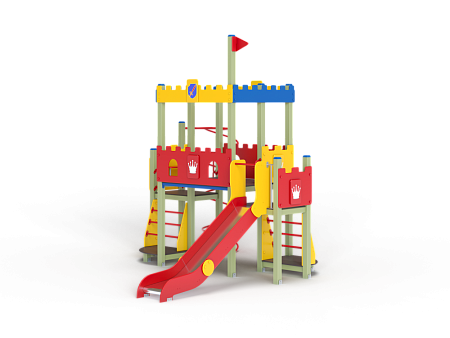 Детский игровой комплекс состоит из трех разновысоких башен. На первой башне установлена лестница, горка, фанерное ограждение и ручки вспомогательные. На второй сдвоенной башне, установлены ограждения фанерные и крыша. На третьей башне установлены ограждение, переклади-ны, шест спираль, лестница и ручки вспомогательные.