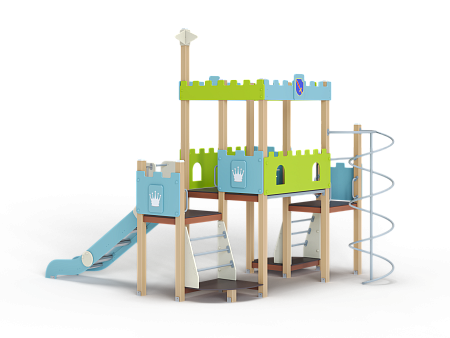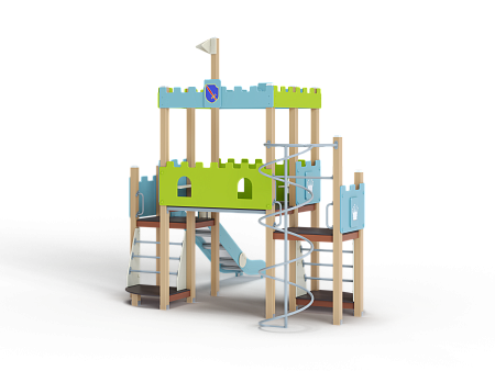 Детский игровой комплекс состоит из трех разновысоких башен. На первой башне установлена лестница, горка, фанерное ограждение и ручки вспомогательные. На второй сдвоенной башне, установлены ограждения фанерные и крыша. На третьей башне установлены ограждение, переклади-ны, шест спираль, лестница и ручки вспомогательные.