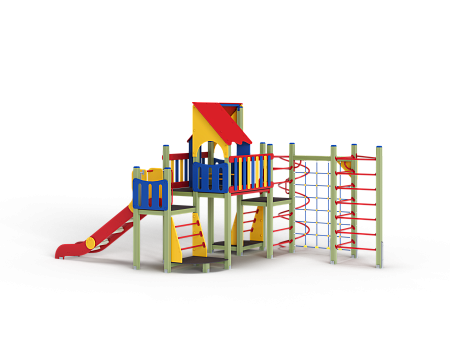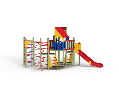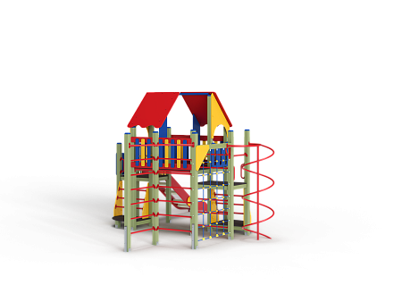 Детский игровой комплекс состоит из трех разновысоких башен. На первой башне установлена лестница, горка, фанерное ограждение и ручки вспомогательные. На второй сдвоенной башне, установлены фанерные ограждения и крыша. На третьей башне установлены ограждение, шест спираль, лестница и ручки вспо-могательные. К третьей башне присоединен гимнастический комплекс, состоящий из сетки полипропиленовой и двух шведских стенок.