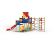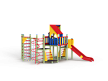 Детский игровой комплекс состоит из трех разновысоких башен. На первой башне установлена лестница, горка, фанерное ограждение и ручки вспомогательные. На второй сдвоенной башне, установлены фанерные ограждения и крыша. На третьей башне установлены ограждение, шест спираль, лестница и ручки вспо-могательные. К третьей башне присоединен гимнастический комплекс, состоящий из сетки полипропиленовой и двух шведских стенок.
