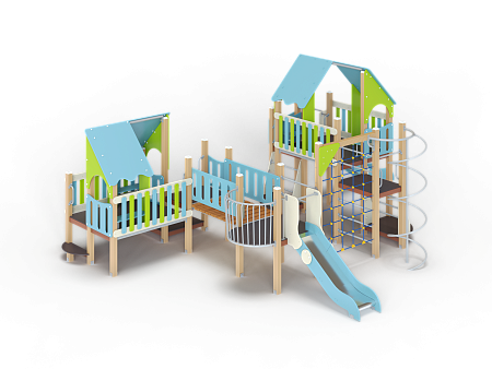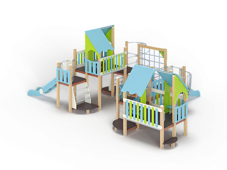 Детский игровой комплекс состоит из шести разновысоких башен. На первой башне установлена лестница, горка, фанерное ограждение и ручки вспомогательные. На второй сдвоенной башне, установлены фанерные ограждения и крыша. На третьей башне установлены фанерное ограждение, шест спираль, лестница и ручки вспомогательные. На четвертой башне установлены горка и балкон. На пятой башне установлено фанерное ограждение, лестница, вспомогательные ручки. На шестой сдвоенной установлены фанерные ограждения и крыша. Третья и четвертая башни соединены сеткой полипропиленовой, четвертая и пятая прямым мостом с фанерными перилами.