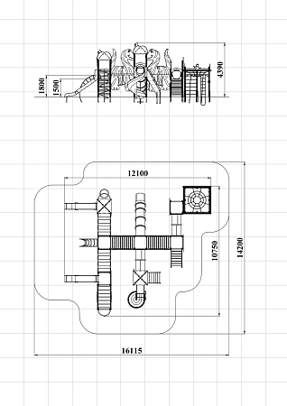 Детский игровой комплекс состоит из семи башен. На первой башне установлены шест спираль, ручки вспомогательные, горка, ограждение фанерное в форме динозавра и крыша. На второй башне установлена лиана наклонная. На третьей башне горка, фанерное ограждение в форме динозавра, перекладина и ручки вспомогательные. Третья башня имеет продолжение в виде гимнастического комплекса состоящего из рукохода, шеста, декоративных накладок и шведской стенки. На четвертой башне установлена пластиковая горка-труба. На пятой башне установлено фанерное ограждение в форме динозавра и лестница. На шестой башне установлены фанерное ограждение в форме динозавра, шведская стенка и ручки вспомогательные. Шестая башня имеет продолжение в виде гимнастического комплекса состоящего из: сетки полипропиленовой, декором в виде динозавриков, перекладин с полипропиленово лестницей, канатами и кольцами гимнастическими, шведских стенок. На седьмой (двухуровневой) башне установлена крыша, фанерные ограждения в форме динозавра, горка пластиковая винтовая, лестница. Первая и вторая башня соединены подвесным качающимся мостом, вторая и третья подвесным качающимся мостом, четвертая и вторая, четвертая и пятая наклонным мостом с металлическими перилами на которые установлены накладки с ручной художественной росписью в виде динозавра, пятая и шестая пластиковой трубой переходом, четвертая и седьмая пластиковой трубой переходом.