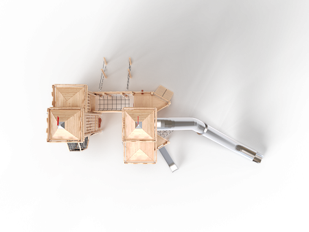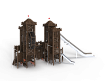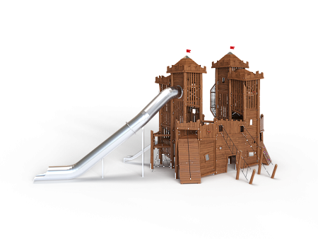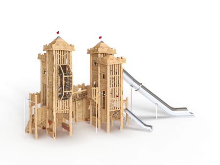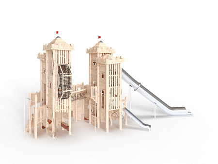 Комплекс выполнен в виде деревянного замка, состоящего из двух башен. Башни соединены канатным переходом. Башни имеют несколько ярусов со страховочными сетками и канатами, препятствующих свободному падению. На первой башне установлены горка из нержавеющей стали, трап наклонный с камнями для лазания, пушка и крыша. На второй башне установлены, трап с канатом, пушка, крыша и горка-труба из нержавеющей стали. С внешней стороны замка установлены два деревянных столба, к которым крепятся две лестницы, ведущие к ограждению канатного перехода в замке.