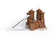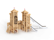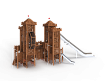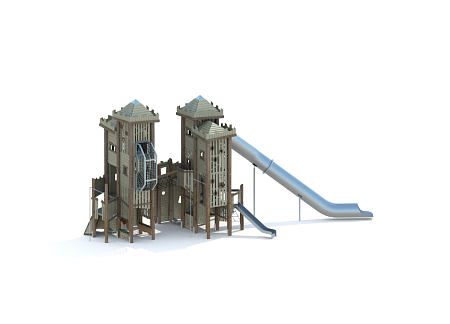 Комплекс выполнен в виде деревянного замка, состоящего из двух башен. Башни соединены канатным переходом. Башни имеют несколько ярусов со страховочными сетками и канатами, препятствующих свободному падению. На первой башне установлены горка из нержавеющей стали, трап наклонный с камнями для лазания, пушка и крыша. На второй башне установлены, трап с канатом, пушка, крыша и горка-труба из нержавеющей стали. С внешней стороны замка установлены два деревянных столба, к которым крепятся две лестницы, ведущие к ограждению канатного перехода в замке.