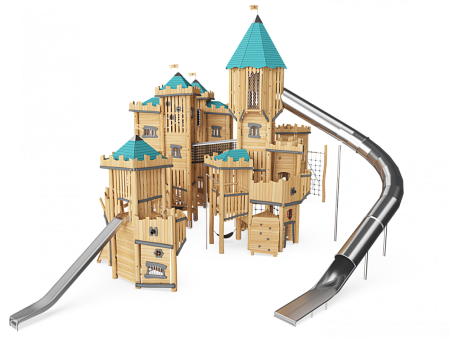 Комплекс выполнен в виде деревянного многобашенного замка. Башни имеют несколько ярусов со страховочными сетками и канатами, препятствующих свободному падению. На башнях установлены трапы, перекладины с канатами, сетки, крыши, пушки декоративные, шесты, канатные переходы, лестницы, качающееся сиденье, горка-лоток, горка-труба и шесты гимнастические из нержавеющей стали.