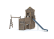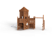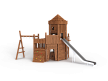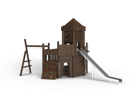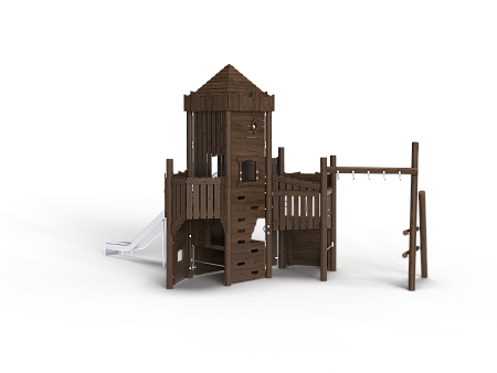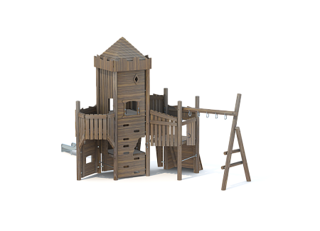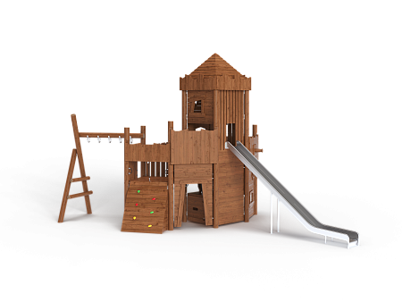 Комплекс выполнен в виде деревянного замка с башней. На башне установлены горка из нержавеющей стали, трап наклонный с камнями для лазания, пушка, ручки, крыша, сетки и балкон. С боковой стороны замка установлен гимнастический комплекс из брёвен и мкталлических ручек, в виде рукохода.