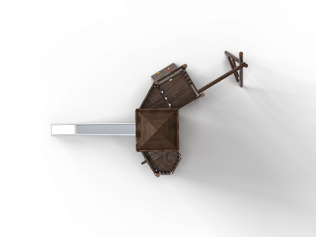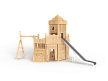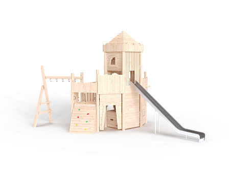 Комплекс выполнен в виде деревянного замка с башней. На башне установлены горка из нержавеющей стали, трап наклонный с камнями для лазания, пушка, ручки, крыша, сетки и балкон. С боковой стороны замка установлен гимнастический комплекс из брёвен и мкталлических ручек, в виде рукохода.