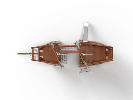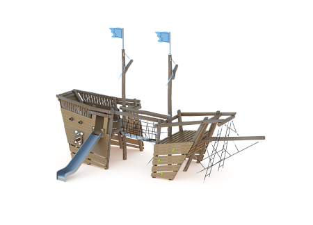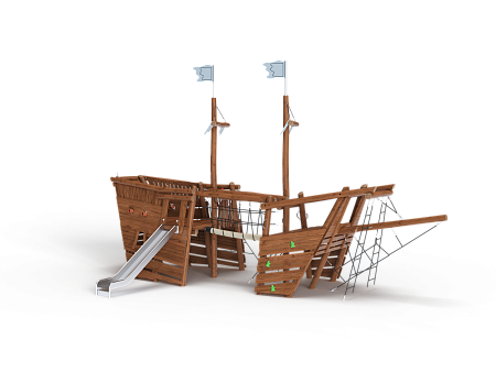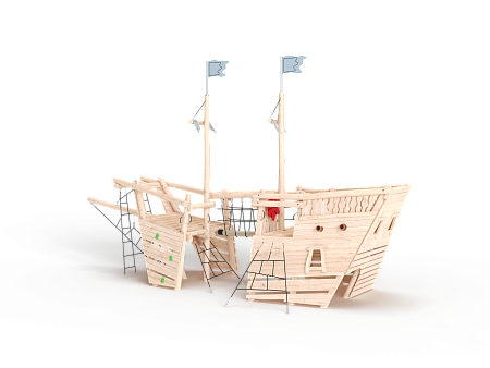 Комплекс выполнен в виде комбинации деревянных столбов и сеток, в совокупности образующих остов корабля с двумя мачтами и двумя башнями с площадками. Башни соединены подвесным бревном.. Обшивка корабля выполнена из деревянного бруса. На задней части корабля установлены пушки, сетка и горка из нержавеющей стали. На носовой части корабля установлены ручки, лестницы канатные и канатный обвес.