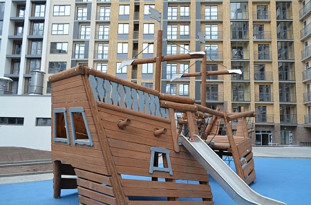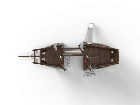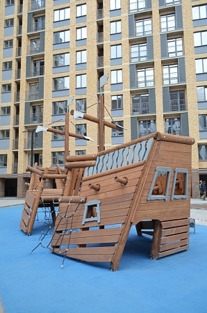 Комплекс выполнен в виде комбинации деревянных столбов и сеток, в совокупности образующих остов корабля с двумя мачтами и двумя башнями с площадками. Башни соединены подвесным бревном.. Обшивка корабля выполнена из деревянного бруса. На задней части корабля установлены пушки, сетка и горка из нержавеющей стали. На носовой части корабля установлены ручки, лестницы канатные и канатный обвес.