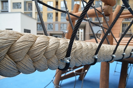 Сетки и канаты изготовлены из многожильного армированного износостойкого каната. Металлические элементы комплекса выполнены из нержавеющей стали.