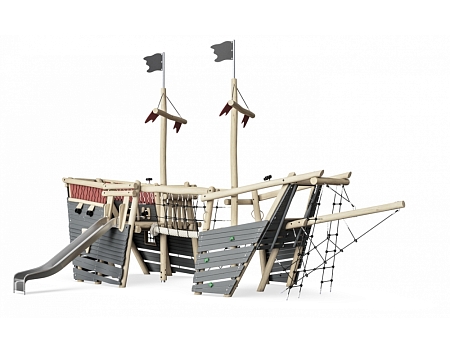 Комплекс выполнен в виде комбинации деревянных столбов и сеток, в совокупности образующих остов пиратского корабля с двумя мачтами и двумя башнями с площадками. Башни соединены подвесным бревном.. Обшивка корабля выполнена из деревянного бруса. На задней части корабля установлены пушки, сетка и горка из нержавеющей стали. На носовой части корабля установлены ручки, лестницы канатные и канатный обвес.
