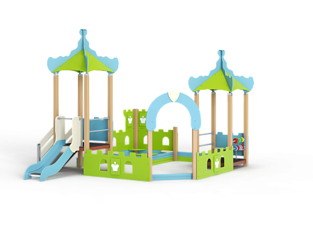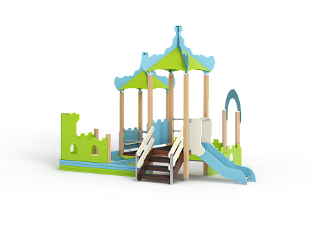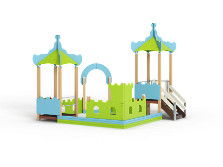 Песочный дворик – модульная конструкция из иг-ровых и развивающих элементов с шахматной тематикой. Конструкция должна быть оборудована двумя башнями- беседками, одной аркой, песочницей, ограждением по периметру. Башни – беседки оборудованы крышами, горкой, лестницей, ограждением, счетами, сидением из фанеры.  Арка с декоративным соединяющим элементом из фане-ры толщиной не менее 24мм. Песочница с четырьмя угловыми фанерными накладками-сидениями по углам и декоративными фанерными огражде-ниями по наружному периметру песочницы. Ограждение по периметру выполнено из фанеры толщиной не менее 24 мм.
