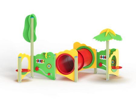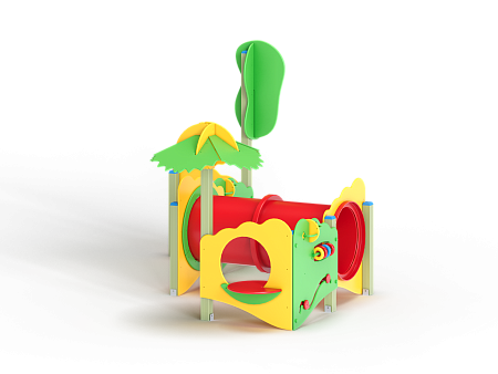 Лабиринт состоит из столбов и крепящихся к ним фанерных стенок с игровым оборудованием в виде мишеней, головоломок, детских счет, трубы-перехода пластиковой и фанерных столиков. На двух столбах установлены две декоративные фанерные крыши в форме кроны дерева и пальмы.