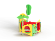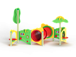 Лабиринт состоит из столбов и крепящихся к ним фанерных стенок с игровым оборудованием в виде мишеней, головоломок, детских счет, трубы-перехода пластиковой и фанерных столиков. На двух столбах установлены две декоративные фанерные крыши в форме кроны дерева и пальмы.
